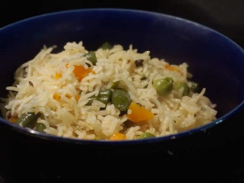 காய்கறிகள் நன்றாக வதங்கியதும் அதில் பாஸ்மதி அரிசி மற்றும் 2 1/2 கப் தண்ணீர் சேர்த்து கொதிக்க விடவும். தண்ணீர் கொதித்தவுடன் உப்பு சேர்த்து 10 நிமிடம் குறைந்த தீயில் சமைக்கவும். நிமிடம் கழித்து அடுப்பை அணைக்கவும்.
