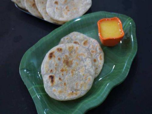 அடுப்பில் ஒரு தவாவை வைத்து அதில் கொஞ்சம் நெய் சேர்த்துக்கோங்க. பொன்னிறமாக வேகும் வரை இரண்டு பக்கமும் திருப்பி போட்டு எடுங்க.